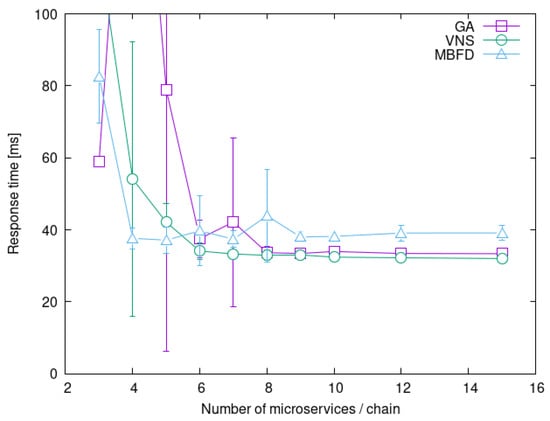 In this analysis, we consider chains of equal length, that is, is constant . The impact of this parameter is evaluated in Section 4.4. In the other analyses, we consider chains composed of five microservices.