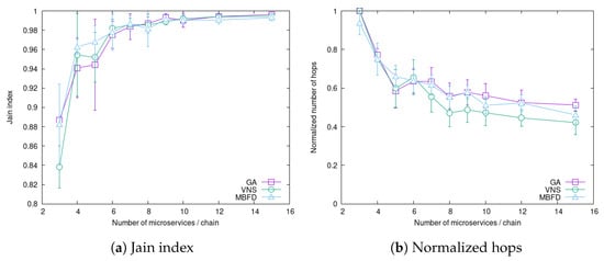 This effect can be observed in Figure 7a as well, where the Jain index is quite low for short service chains. Again, we observe that the load balancing approach of the MBFD algorithm provides good load balancing even in the case of short service chains (i.e., the blue line is higher than the other lines in the leftmost part of the graph), explaining the relatively low response time in Figure 6. At the same time, from Figure 7b it can be observed that the MBFD algorithm is not very effective at reducing the number of hops to avoid unnecessary network delays, as shown by the blue line in the graph. In a similar manner, the genetic algorithm does not perform well from this point of view due to the large space to be explored and its completely random approach to exploration of the solution space. Instead, the VNS algorithm, takes advantage of the neighborhood definition based on the problem characteristic, and can provide fast and accurate searching of the solution space, as indicated by the high Jain index in Figure 7a, and the low number of hops in Figure 7b, which together explain the low response time in Figure 6.