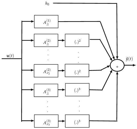 In Section 5.5, we show that the Wiener, Hammerstein and W-H models are equivalent to structured Volterra models. This equivalence is at the origin of the structure identification method for block-oriented systems, which will be presented in Section 5.5.4. Tensor-based methods using this equivalence have been developed to estimate the parameters of block-oriented nonlinear systems [,,,]. These methods are generally composed of two steps. In the first one, the Volterra kernel associated with a particular block-oriented system is used to estimate the LTI component(s). Note that there exist closed-form solutions for estimating only the Volterra kernel of interest. Such a solution is proposed in [,] for a third-order and fifth-order kernel, respectively. Then, in a second step, the nonlinear block is estimated using the LS method. An example of a tensor-based method for identifying a nonlinear communication channel represented by means of a W-H model was proposed in [] using the associated third-order Volterra kernel.