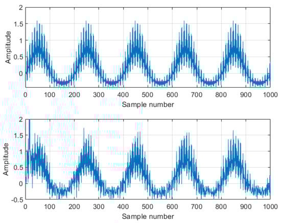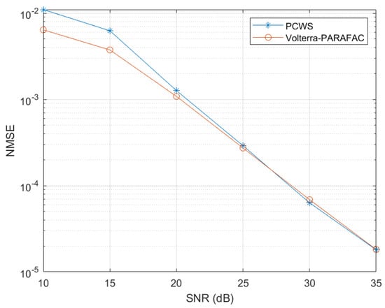 Among the numerous application areas of Volterra models, we can mention chemical and biochemical processes [], radio-over-fiber (RoF) wireless communication systems (due to optical/electrical (O/E) conversion) [,], high-power amplifiers (HPA) in satellite communications [,], physiological systems [], vibrating structures and more generally mechatronic systems like robots [], and acoustic echo cancellation [].