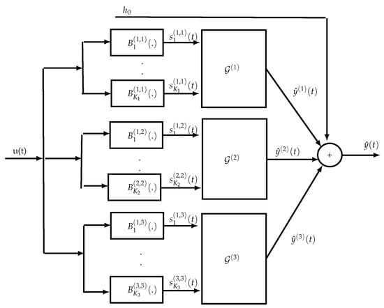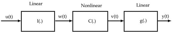 Another approach for ensuring a reduced parametric complexity consists in considering block-oriented NL models, composed of two types of blocks: linear time-invariant (LTI) dynamic blocks and static NL blocks. The linear blocks may be parametric (transfer functions, FIR models, state-space representations) or nonparametric (impulse responses), whereas the NL blocks may be with memory or memoryless. The different blocks are concatenated in series leading to the so-called Hammerstein (NL-LTI) and Wiener (LTI-NL) models, extended to the Wiener–Hammerstein (LTI-NL-LTI) and Hammerstein–Wiener (NL-LTI-NL) models, abbreviated W-H and H-W, respectively. To extend the modeling potential of block-oriented models, several W-H and H-W models can also be interconnected in parallel. Although such models are simpler but less general than Volterra models, they allow us to represent numerous nonlinear systems. One of the first applications of block-oriented NL models was for modeling biological systems []. A lot of papers have been devoted to the identification of block-oriented models and their applications. For more details, the reader is referred to the book [] and the survey papers [,].