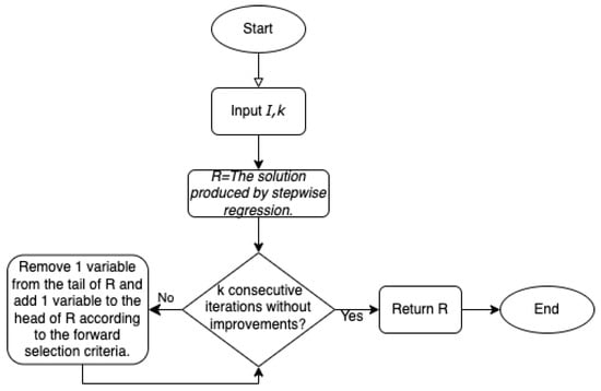 In addition to the combinatorial optimization problems studied in Cerrone et al. (2017) [], the authors also began to study stepwise linear regression. Their experiments were modest and preliminary. A pseudo-code description of their CG stepwise linear regression approach is provided in Algorithm 1. For the problem to be interesting, we assume that the number of explanatory variables to begin with (say, p) is large and the number of these variables that we want in the model (say, k) is much smaller.
