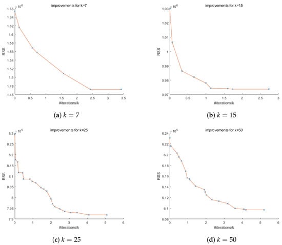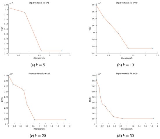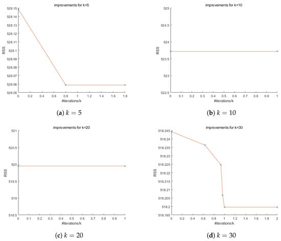We now look back at the cases of Figure 5b,c using random initializations. We run 10 experiments on the Insurance dataset for  and 10 for  and plot the best, in terms of the final RSS, out of 10 experiments.