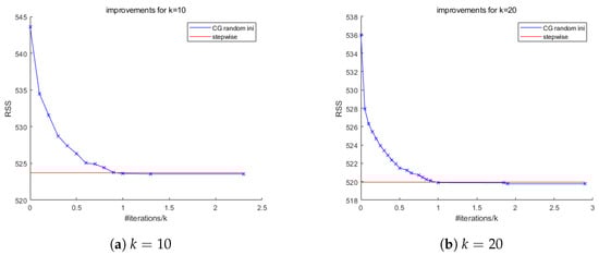 Since we are most interested in the linear regression problem where k is fixed, we seek to compare the results of best subset selection, CG, and stepwise regression. We will use the R code from [], our CG code, and the stepwise regression code from (http://www.science.smith.edu/~jcrouser/SDS293/labs/lab8-py.html, accessed on 11 September 2022) in our experiments. For now, we can say that best subset selection takes much more time than stepwise regression and it typically obtains much better solutions. Our goal will be to demonstrate that CG represents a nice compromise approach. We expect CG solutions to be better than stepwise regression solutions and the running time to be much faster than it is for the best subset selection solutions.