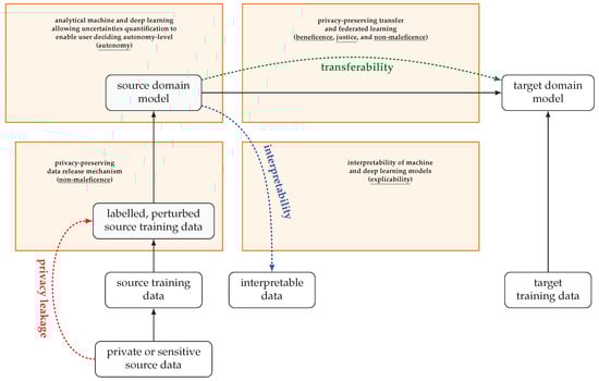 Solution approaches to address issues concerning TAI have been identified in Table 1; however, a unified solution approach addressing all major issues does not exist. Despite the importance of the outlined TAI principles, their major limitation, as identified in [6], concerns the fact that the principles are highly general and provide little to no guidance for how they can be transferred into practice. To address this limitation, a data-driven research framework for TAI was outlined in [6]. However, to the best knowledge of the authors, no previous study presented a unified information theoretic approach to study the privacy, interpretability, and transferability aspects of trustworthy AI in a rigorous analytical manner. This motivated us in this study to develop a novel information theoretic approach for addressing the privacy, interpretability, and transferability aspects of trustworthy AI in a rigorous analytical manner. This study introduces a unified information theoretic approach to “privacy-preserving interpretable and transferable learning”, as represented in Figure 1, for addressing trustworthy AI issues, which is the novelty of this study.