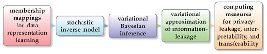 In order to derive analytical expressions for the defined privacy leakage, interpretability, and transferability measures, the stochastic inverse models (governing the relationships amongst variables) will be required. In this study, the variational membership mappings are leveraged to build the required stochastic inverse models. Membership mappings [14,15] have been introduced as an alternative to deep neural networks in order to address the issues such as determining the optimal model structure, smaller training dataset, and iterative time-consuming nature of numerical learning algorithms [16,17,18,19,20,21,22]. A membership mapping represents data through a fuzzy set (characterized by a membership function such that the dimension of the membership function increases with an increasing data size). A remarkable feature of membership mappings is that these allow an analytical approach to the variational learning of a membership-mappings-based data representation model. Our idea is to employ membership mappings for defining a stochastic inverse model, which is then inferred using variational Bayesian methodology.