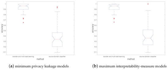 Figure 6 summarizes the experimental results where accuracies obtained by both minimum privacy-leakage models and maximum interpretability-measure models have been displayed as box plots.