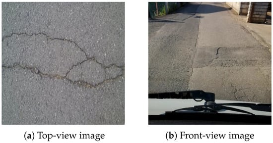 Different types of image used in road pavement damage detection research. (a): Top-view image. (b): Front-view image.