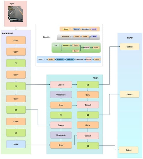 The YOLOv5 network initiates image pre-processing, then resizes the image to 640 × 640 × 3 before feeding it into the backbone network. The greater efficiency of YOLO with a 640 × 640 image can be linked to the algorithm’s built-in design []. The YOLO algorithm partitions an image with dimensions of 640 × 640 into a grid consisting of 20 × 20 cells, where each cell measures 32 × 32 pixels. This particular grid dimension facilitates an optimal equilibrium in detecting objects of varying sizes.