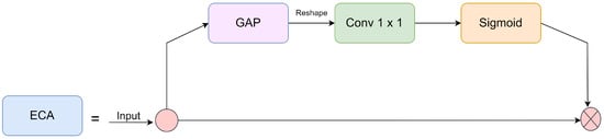 The ECA-Net is a recently developed attention mechanism characterized by its lightweight and efficient design []. It improves the Squeeze and Excitation Network (SENet) framework []. The YOLOv5 model was enhanced by integrating an ECA attention mechanism to enrich defect detection accuracy in complex scenes. Figure 4 depicts the ECA attention mechanism. This integration facilitated the model’s focus on object regions while training and reducing insignificant information representation. ECA employs the one-dimensional sparse convolution filter to generate channel weights to replace the full connection layer in the SENet. According to the study’s findings, implementing the proposed method can enhance the precision of predictions without imposing additional computational demands. Furthermore, the method can be readily integrated into mobile networks, facilitating widespread deployment.