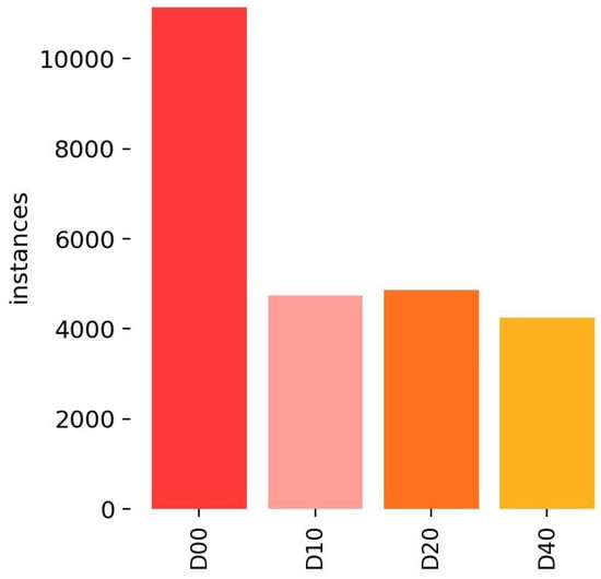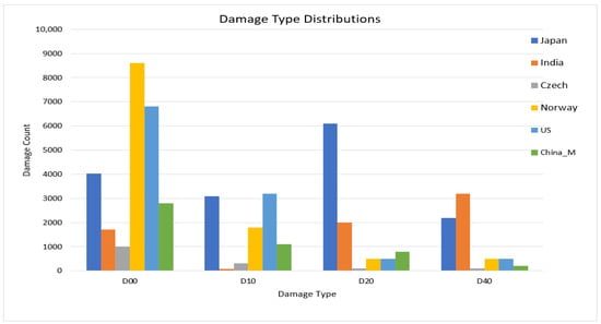 Various intelligent equipment, such as drones and dashcams, have made the automatic collection of road damage data much more accessible in recent years. Especially the dashboard-mounted camera is quicker to install and more effective than manual scanning techniques in detecting road damage. Moreover, classifying road damage data manually is a time-consuming process. An existing benchmark dataset was employed to train the road damage detection model. Most top-view datasets do not have the class name; hence, classification is impossible. The road damage detection dataset (RDD 2022) is the largest front-view road damage dataset ever compiled about road pavement damage, encompassing four types of damage in six countries. This dataset follows the preceding RDD dataset and is an expanded version of the earlier RDD 2020 [] and RDD 2018 [] datasets. While the RDD 2018 dataset has 9053 photos and the RDD 2020 dataset contains 26,336 images from three countries, the RDD 2022 dataset [] comprises 47,420 images compiled from numerous sources in six nations. It includes Japan, the United States, Norway, the Czech Republic, India, China Motorbike, and China Drone. Figure 5 depicts the distributions of damage types (of the four main damage types) among the six countries. It also illustrates the diversity of road pavement damage across countries by showing that India has a more significant number of D40, whereas D00 is adequately represented in the dataset for all countries. Moreover, Japan, India, and Norway have a higher rate of pavement damage than the other three nations. From the present standpoint, this cutting-edge dataset is the most practical and effective for road pavement damage detection and classification.