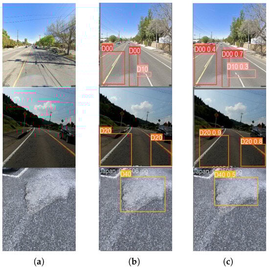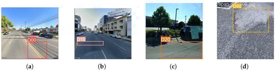 RDD 2022 contains 47,420 images, of which 36,000 have annotations from six distinct countries. Approximately 14,700 of the 36,000 annotation files were found to be empty as they did not contain an object, so those images were manually removed by us. YOLO is designed to detect objects in a single pass across the entire image; unlike two-stage detectors (such as Faster R-CNN), this method does not require negative photos for training. The dataset had a country-specific sub-folder for each country’s images and corresponding annotations. China-Drone was omitted in our work because it needed to be obtained from a front-mounted vehicle image for this research. A close inspection of the RDD 2022 dataset provides us with a few insights for selecting images efficiently. Countries such as Norway and Japan had various image sizes. For example, the resolution of the Norway photos (3072 × 3720) is incompatible with our GPU configuration. Each image was manually scaled to 640 × 640 to train the YOLOv5 model. Numerous photos have distinct labels for a single country. For instance, China Motorbike has a label named Repair. Japan and India have multiple labels with the uncommon names D01, D11, D43, D44, and D50. In light of this, the unique classes were manually eliminated, the remaining classes were merged, and the four common categories were retained for six countries. Four types of damage were included: D00: longitudinal cracks, D10: transverse fractures, D20: alligator cracks, and D40: potholes. Figure 6 depicts an example of these four classes.