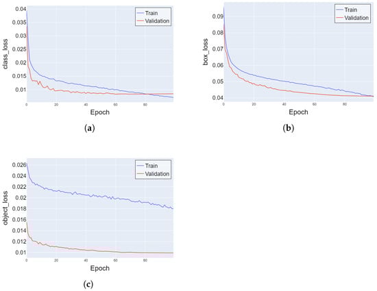 The weighting factors denoted by a, b, and c correspond to the three partial losses. Equations (2)–(4) represent all these partial losses. We utilized the default settings as suggested in the YOLOv5 implementation, wherein we set the values of a, b, and c to 1.0. This decision also corresponds with the results of other cutting-edge research, such as YOLOv4 and YOLOv3, where these setup values have exhibited favorable compromises between accuracy and computational efficacy [,].