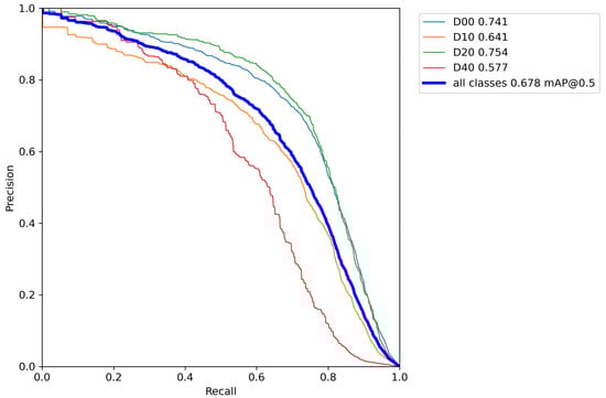 The Mean Average Precision (mAP) is a typically used metric for assessing object detection models. Initially, the precision and recall metrics are calculated for every detection within the category across a spectrum of confidence threshold values. Subsequently, the mean Precision is determined by utilizing the region beneath the class’s precision–recall curve (AUC). Upon computation of the AP score for every class, the mAP score is derived using the average of these individual scores. The mAP score is a significant metric that provides a comprehensive evaluation of the detection performance of the model across all categories in the dataset. The mathematical expression for mAP is presented in Equation (19).