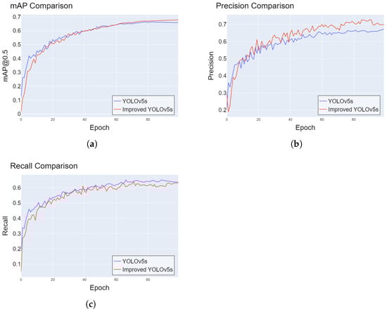 Comparison of performance between YOLOv5s-baseline and our improved YOLOv5s: (a) mAP0.5 comparison; (b) precision comparison; (c) recall comparison.