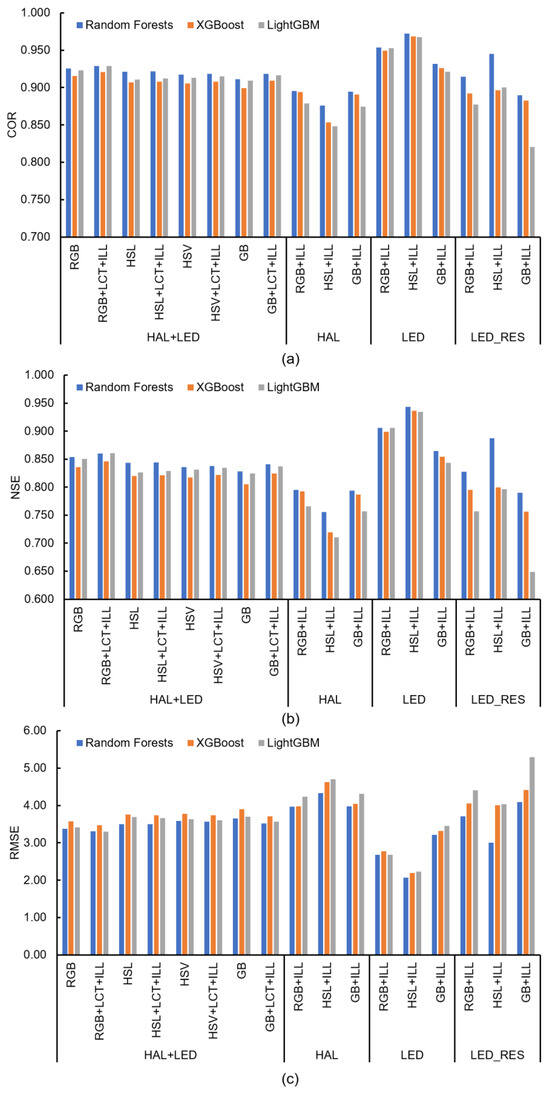 In this study, the prediction accuracy was high, with a COR of 0.85 or higher even in the case of limited illuminance, and the applicability was verified under extrapolated conditions (LED_RES). In this case, the highest prediction accuracy was obtained when the HSL value was used as the model input, as in the case of data obtained under LED light sources (Figure 4b).