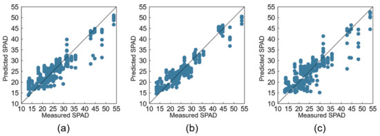Following a previous study where [8] reported the results of a similar analysis excluding the R value, which is a wavelength absorbed by water molecules, we conducted modeling using only GB values, excluding the R values in this study. As a result, the GB-based model also showed high accuracy, with a COR of 0.85 or higher. However, the GB-based model showed a lower model performance than the RGB-based models. This suggests that the GB-based models can exclude the effect of water molecules, but the R values may contain important factors for the SPAD value prediction.
