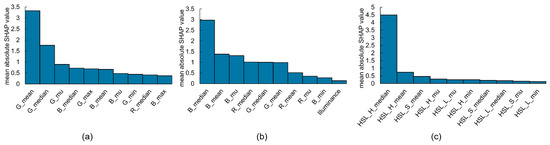 Figure 5 shows the top 10 mean absolute SHAP values for data collected under halogen and LED light sources (HAL+LED), with RGB values, illuminance, and color temperature as the model input (HAL+LED_RGB+LCT+ILL; Figure 5a); for data taken under LED light sources (LED) with RGB values and illuminance as the input values (LED_RGB+ILL; Figure 5b); and for data taken under HSL values and illuminance (LED_HSL+ILL; Figure 5c). The figure compares the differences in light source information and color information among the three models from the top five CORs of the Random Forests in Figure 2, excluding the two models using illuminance-limited data and the model using GB values. In the HAL+LED_RGB+LCT+ILL model, the mean value of G contributed the most (Figure 5a). The LED_RGB+ILL model indicated that the median value of B had the highest contribution to the SPAD value prediction, followed by the mean value of B (Figure 5b). The LED_HSL+ ILL model exhibited the median value of H had the highest contribution to the model (Figure 5c).