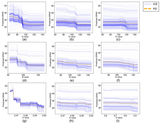 Partial dependence and individual conditional expectations in the best model for SPAD value prediction with Random Forests using RGB values in halogen and/or LED light sources: (a) HAL+LED_RGB_G_mean, (b) HAL+LED_RGB_G_median, (c) HAL+LED_RGB_G_mu, (d) LED_RGB_B_median, (e) LED_RGB_B_mean, (f) LED_RGB_B_mu, (g) LED_HSL_H_median, (h) LED_HSL_H_mean, and (i) LED_HSL_S_mean.