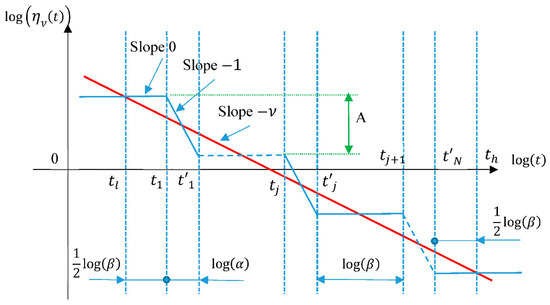 The functions and of relation (5) are represented in Figure 1 for , as a function of . For and , the functions and behave, respectively, as lines of slope 1 and −1. The function given by relation (2) has a slope of on a logarithmic scale. Thus, taking inspiration from the work which aimed to approximate fractional integrator operators in the frequency domain [27,28,29,30,31,32], and adapting them to the time domain, the function can be approximated by choosing the appropriate values of and in an alternation of function and .