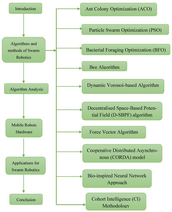 Various papers are organised according to the algorithmic approaches used in swarm robotics, including Particle Swarm Optimisation (PSO) and Ant Colony Optimisation (ACO). Some articles discussed the various setups and parts of the sensors, CPUs, and communication modules used in swarm robotic platforms. Readers will find a comprehensive and organised synopsis of the many facets of swarm robotics in the reviewed literature according to this categorisation.
