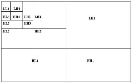 DWT transforms the host image into four sub-bands: low-low (LL), low-high (LH), high-low (HL), and high-high (HH). The LL sub-band contains the approximation part, while the other three sub-bands contain detailed information such as the edges and textures of the image. Each sub-band can be further decomposed into four sub-bands, resulting in a multi-level decomposition. The magnitude of DWT coefficients is usually larger in the LL sub-band compared to the other sub-bands. In our proposed method, we have decomposed the host image using a four-level DWT on the LL sub-band. Figure 2 shows the four-level DWT on the LL sub-band.