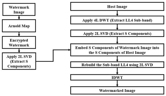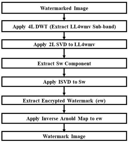 The proposed method for embedding the watermark image into the host image is illustrated by Figure 3. It is not an embedding operation of a direct substitution. Rather, we have performed different levels of DWT and SVD operation on both host and watermark images before the embedding operation. At first, the Arnold map is used for encrypting the watermark image to ensure the security of the system. We have applied SVD twice both for LL4 and ew for increasing robustness and security. Watermark embedding with different SVD levels resists the geometric attacks more effectively. Therefore, two-level (2L) SVD is applied to LL4 to extract S components. The method applies 4L DWT to the host image and extracts the LL4 sub-band. After that, 2L SVD is applied to that sub-band and S components are extracted. Then, the method embeds the watermark image’s S components into the host image’s S components with a scaling factor that is chosen manually to obtain the best value so that there maintains a better trade-off between the imperceptibility and robustness of the system. In this study, we have used . After that, the LL4 sub-band is rebuilt and the inverse DWT (IDWT) is applied to obtain the watermarked image. Watermark extraction is conducted in a reverse way which is shown by Figure 4. Initially, 4L DWT is applied to the watermarked image to extract LL4wmv. Then, 2L SVD is applied to it to extract the Sw component. After that, inverse SVD (ISVD) is applied to Sw to extract the encrypted watermark, ew. Finally, the system applies the inverse Arnold map to ew to obtain the watermark image. We have encrypted the watermark with Arnold mapping; our main focus is to extract the watermark image from the watermarked image.