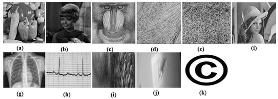Input images: (a) Pepper; (b) Female; (c) Baboon; (d) Straw; (e) Grass; (f) Lena; (g) Chest X-ray; (h) ECG; (i) Fish Species; (j) Marine Animal; (k) Copyright (watermark image).