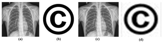 (a) Chest X-ray (Host Image); (b) Copyright (Watermark Image); (c) Watermarked Image; (d) Extracted Watermark.