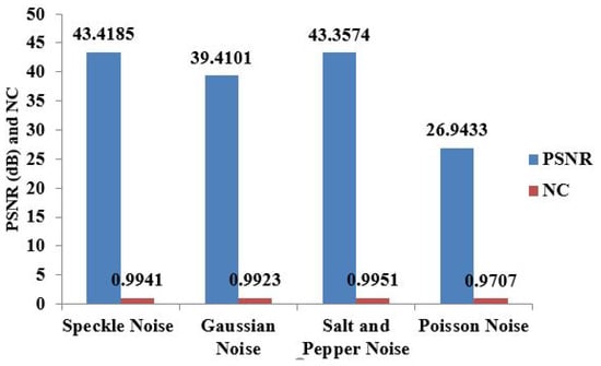 Table 2 analyzes speckle noise (SN), Gaussian noise (GN), SPN, and Poisson noise (PN). For the chest X-ray image, the image is very much distorted by the PN attack, since the watermarked image’s PSNR (26.9433 dB) is sufficiently low for visualization. But, our system can still extract the watermark image from the generated watermarked image, as NC is close to 1. Figure 7 shows the PSNR (dB) and NC values after the noise attack for the chest X-ray medical image.