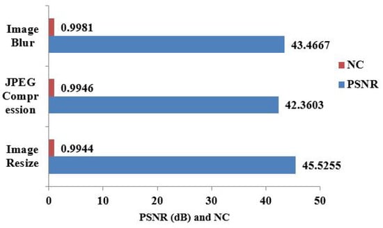 Image blur and geometric attacks like image resize and jpeg compression are highlighted in Table 4. We used the built-in function of Matlab “imresize” for image resizing. This means that the “imresize” function has been used as B = imresize(A, [rows cols]), which resizes image A to image B so that it has the desired size containing a specified number of rows and cols with the Matlab default cubic interpolation method. In Figure 9, for the chest X-ray image, the resultant PSNR and NC values are shown in place of the image resize, jpeg compression, and image blur attacks.