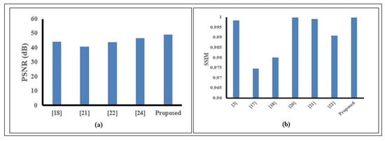 We compared the PSNR (dB) and SSIM of our proposed method with other methods, which are shown in Figure 12. Figure 12a shows the comparison of PSNR values between our proposed method with popular watermark methods for chest X-ray images. It demonstrates that compared to other approaches, our method obtains the highest PSNR value (48.97 dB). Figure 12b shows the comparison of SSIM between our proposed method with other watermark methods for the Lena image. From this Figure, we observed that the SSIM value of our proposed method (0.9998) is greater than the existing methods.