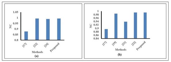 We compared our proposed method for noise, filter, and blur attacks with state-of-the-art methods for chest X-ray images and found promising performance. In Figure 13, we compared SN and GN attacks with other methods. Figure 13a exhibits the highest NC value (0.9941) versus other methods for the SN attack. Moreover, Figure 13b displays the highest NC value (0.9923) versus existing methods for a GN attack. From Table 8, we found the highest NC value for SPN attack versus existing recent methods. We showed our comparison for MF and LPGF attacks in Figure 14. Here, Figure 14a exhibits the highest NC (0.9942) for our method versus others for the MF attack. For the LPGF attack in Figure 14b, our method shows the highest NC (0.9994) versus method [21], where NC = 0.9961. Also, we found a greater NC (0.9981) for our method than method [12], where NC= 0.9780 for the image blur attack.