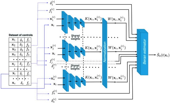The architecture of the neural network, consisting of n subnetworks that implement the neural kernels, is shown in Figure 2. Examples produced from the dataset of controls are fed to the whole neural network, such that each pair , , is fed to each subnetwork, which implements the kernel function. The output of each subnetwork is kernel . All subnetworks are identical and have shared weights. After normalizing the kernels, we obtain n weights , which are used to estimate SFs by means of the Beran estimator in (14). The block of the whole neural network that implements the Beran estimator uses all weights , , and the corresponding values and , . As a result, we obtain SF . In the same way, we compute SFs for all . These functions are the basis for training. In fact, the normalization block and the block that implements the Beran estimator can be regarded as part of the neural network, and they are trained in an end-to-end manner.