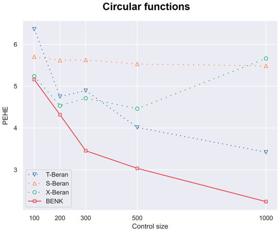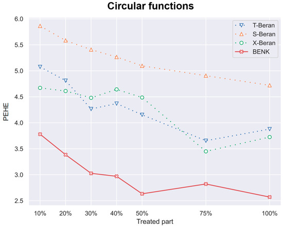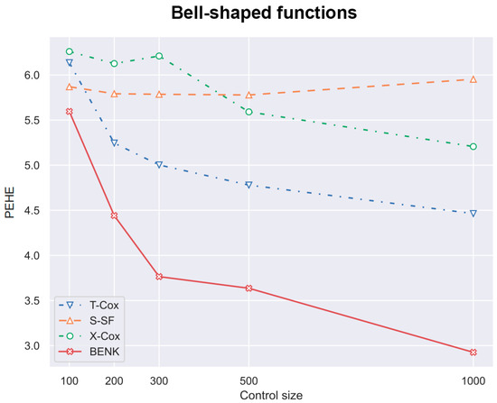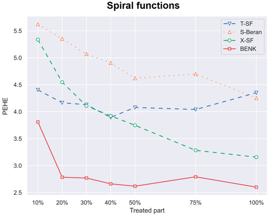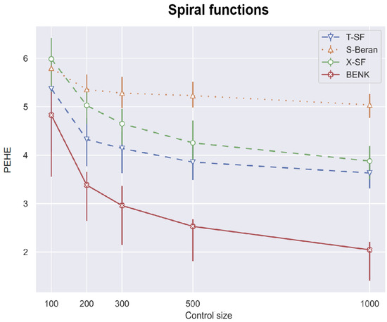 Another interesting question is how the CATE estimators depend on the proportion q of treatments and controls in the training set. Particularly, for the proposed BENK model, we try to study whether an increasing number of treatments (the set ) provides better CATE results with an unchanged number of controls (the set ). The corresponding numerical results are shown in Figure 7, Figure 8 and Figure 9. One can see from Figure 7, Figure 8 and Figure 9 that the enhancement in the PEHE is sufficient in comparison with other CATE estimators when q is changed from 10% to 20% in the experiments with the spiral and bell-shaped functions. Moreover, we again observe the outperformance of BENK in comparison with other estimators.
