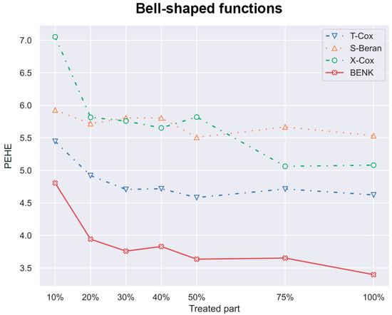 The PEHE metric as a function of the part of treatments when the bell-shaped function is used for generating examples.