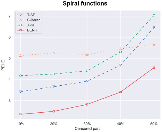 Table 2 aims to quantitatively compare results under the following conditions: , , , , . One can see from Table 2 that BENK provides outperforming results. Let us compare results obtained for BENK with the results provided by other models in Table 2. For comparison, we can apply the standard t-test. The obtained p-values for all pairs of models are shown in the last column. We can see from Table 2 that all p-values are smaller than . Hence, we can conclude that the outperformance of BENK is statistically significant. It is interesting to note from Table 2 that methods based on the Cox model (T-Cox, S-Cox, X-Cox) show worse results. This can be explained by the weak assumption of the linear relationship of features, which takes place in the Cox model. This assumption contradicts the complex spiral, bell-shaped and circular functions and does not allow us to obtain better results. It should be pointed out that T-NW provides the best result for the bell-shaped generating function among results given by methods other than BENK. This is explained by the fact that the bell-shaped function is close to the Gaussian function; therefore, the method based on using Nadaraya–Watson kernel regression does not crucially differ from BENK. It is also interesting to note that the efficient methods such as the S-learner and the X-learner often provide worse results in comparison with the T-learner, which is rather weak in standard CATE tasks. This is due to peculiarities of survival data, which differ from the standard regression and classification data.