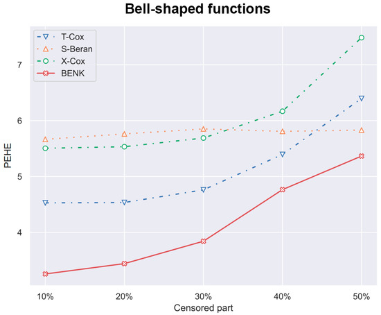 The PEHE metric as a function of the amount of censored observations in the training dataset when the bell-shaped function is used for generating examples.
