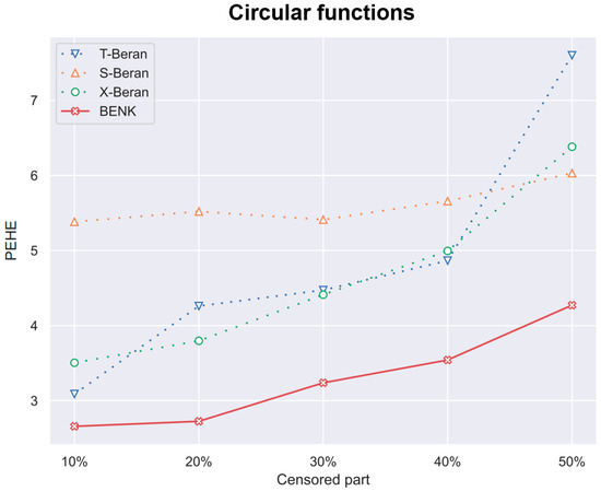 In the previous experiments, the amount of the censored data was taken of all observations. However, it is interesting to study how this amount impacts the PEHE of the CATE estimators. Figure 10, Figure 11 and Figure 12 illustrate the corresponding dependencies when different generating functions are used. It can be seen from Figure 10, Figure 11 and Figure 12 that the PEHE metrics for all estimators, including BENK, increase with the amount of censored data.