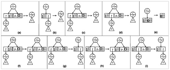 TSDDs, as a variant of SDDs, apply trimming rules that integrate the trimming rules of SDDs and ZSDDs. Hence, the trimming rules of TSDDs include the trimming rules of SDDs and ZSDDs that are shown in Figure 1a–d, and we do not introduce them in the following definition. Hence, the trimming rules of TSDDs start from (e). In addition, these rules also include five new rules. We then show the compression and trimming rules for TSDDs as follows: