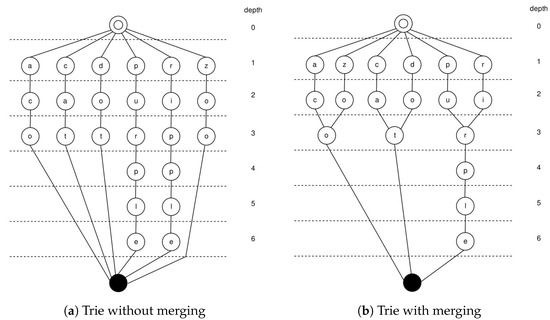 Here, we give an example using a dictionary that contains six words: aco, cat, dot, purple, ripple, and zoo. The tries before and after merging the nodes are shown in Figure 2. There are two special nodes in the graph, namely, the root node with a depth of 0 and the tail node represented by a solid circle without a depth. Except for these two nodes, each other node stores a letter, and we stipulate that all paths representing words start at the root node and end at the tail node. Except for the tail node, all other nodes have a depth, and the maximum depth on a path is the number of letters in the word represented by that path. After we merge the nodes, we can see that the number of nodes has significantly decreased.