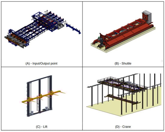 Figure 4. Main elements of a shuttle–lift–crane AS/RS. - Shuttles: Vehicles handle horizontal movements, transporting bundles between I/O points and racks. They can transport one or two bundles, depending on single-depth or double-deep storage, as illustrated in Figure 4B.