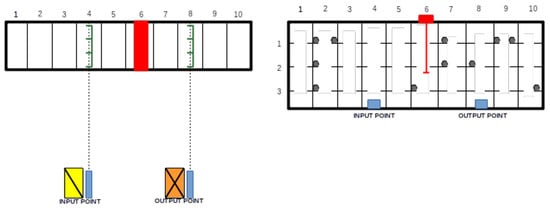 An illustration of the SLC-AS/RS under consideration is depicted in Figure 5. The layout assumes a configuration with one crane and two lifts within the rack (with one lift designated for each I/O point). The warehouse comprises ten aisles, each spanning a length of one meter. For the input shuttle, traversal of the rack occurs through the fourth aisle, while the output shuttle navigates along the eighth aisle. Within each aisle, storage consists of three levels, each standing at a height of one meter. The crane’s movement follows a uniform, linear trajectory, covering one meter per second in both length and height. The unidirectional travel time for the lifts is presumed to be 3 s, while the upload and download times are estimated at 5 s. Additionally, the one-way travel time for shuttles to reach the rack is set at 6 s. The operations to be executed include: