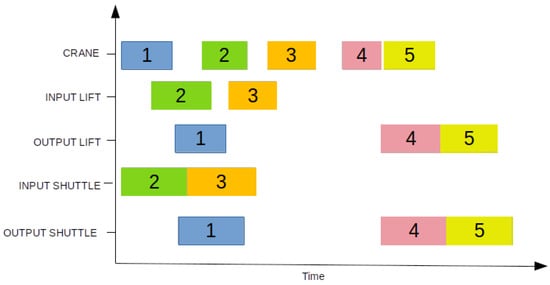 The solution generated by the proposed algorithm includes a set of operations , encompassing both input and output operations aimed at fulfilling the requests. Each input operation corresponds to an empty storage location where the entry bundle will be stored. Similarly, every output operation is linked to a bundle in stock for retrieval. Sorting the operations by their scheduled execution time enables the computation of the makespan through a discrete event simulation. This simulation can accommodate stochastic processing times and is applicable irrespective of the system’s complexity. Notably, the deterministic simulation considered here naturally extends to a stochastic one. During each simulation run, deterministic processing times can be substituted with randomly generated times using corresponding probability distributions. The specific probability distributions employed to model these random processing times are derived from fitted historical data. To elucidate the computation of the makespan analytically, a simple example is provided below, showcasing machines and operations: