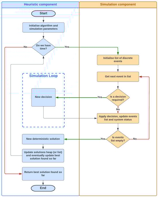 To synchronize the various events within the warehouse, the BR heuristic is enhanced with a discrete event simulation. Employing DES allows for a consistent and reliable evaluation of the impacts of BR decisions. Given the system’s high parallelism and synchronization complexities, measuring the makespan of a set of operations would be infeasible without DES. Consequently, during the deterministic discrete event simulation of the system, a BR process is employed at each decision stage to select the next building element from a list of candidates. This hybrid BR-DES approach facilitates the rapid generation of a range of feasible solutions (in terms of event synchronization) guided by the logic of the constructive heuristic, ensuring potentially favorable solutions in terms of quality. The integration of BR with DES is depicted in Figure 7. The entire algorithm can be visualized as a multi-start framework, where, until the computational time does not surpass a predefined threshold, new, random but oriented solutions are continually generated from scratch. This architecture comprises two distinct components: the BR heuristic, which includes a Monte Carlo simulation that makes random but oriented decisions, and the discrete event simulation. Each new solution is created by running the simulation, delegating decisions to BR within what we term the algorithm simulation loop. Subsequently, the new solution is compared with the best solution obtained so far and this is replaced if superior.