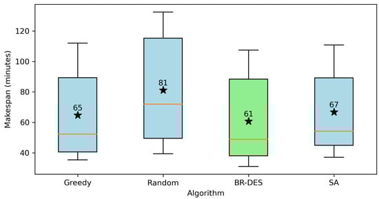 Comparison of makespans (in minutes) achieved by the greedy, random, BR-DES, and SA approaches for each instance (row).
