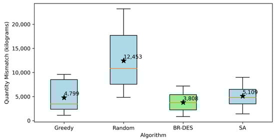 For the comparison, we employed the actual layout of an SLC-AS/RS consisting of three racks, each containing 500 storage locations, with two input and two output points. In the computational experiments, 12 different request lists were used, each varying in size (30, 60, 90, and 150 requests). Every algorithm was executed three times on each request list to monitor both its average performance and its variability. The comparison primarily focuses on the total makespan, expressed in minutes (Table 4), and computational time (Table 5). Additionally, we monitored the overall mismatch between the quantities and quality levels required by customers (Table 6). The parameters of the proposed algorithm, namely the betas of the geometric distribution used in the selection of racks () and bundles (), were adjusted in each iteration according to trimmed Gaussian distributions. The means of these Gaussian distributions ( and ) were determined through a series of empirical experiments, exploring combinations of and with a step of . Both were set with a standard deviation of . Regarding SA, the same parameter values as proposed in Bertolini et al. [] were employed. All BR-DES and SA results were acquired after exploring 1000 solutions. The makespan results are presented in Table 4. As anticipated, our proposed algorithm consistently outperforms the greedy and random approaches, as well as the SA algorithm, in all instances. Notably, the random and greedy approaches often fail to find feasible solutions, whereas our algorithm consistently obtains feasible solutions in all scenarios.