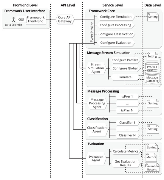 The front-end level defines the elements needed to interact with end users, grouped under the concept of the framework user interface and organised according to the model, view, controller (MVC) architectural pattern. The framework front-end is intended for the data scientists, and is based on a graphical user interface (GUI). The API level contains the service that acts as an application programming interface (API) for the other of the services. This allows for the centralised exposure of all the endpoints defined in the backend. This level is the core of the solution and consists of five main modules: Framework Core, Message Stream Simulation, Message Processing, Classification, and Evaluation. Each of the modules in the service level accesses the data level through the persistence services in the service layer (Figure 1 shows the relationship between the services and their main data sources, with dashed lines to indicate that this relationship is indirect). The following is a description of each of the core-level modules that make up the proposed framework.