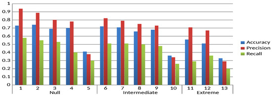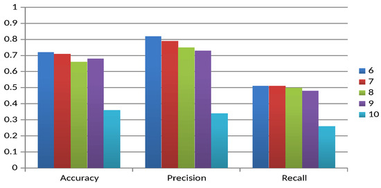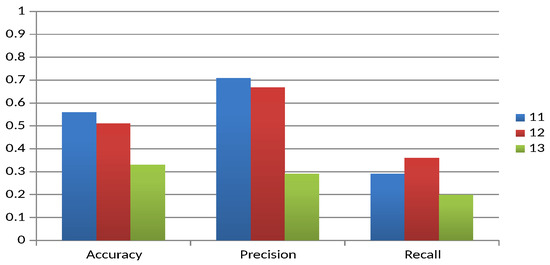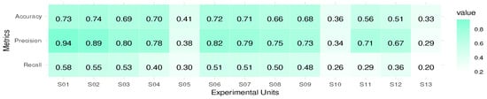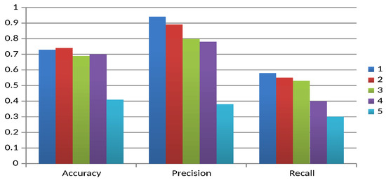Figure 3 and Figure 4 show the results obtained for accuracy, precision and recall for each experimental unit.