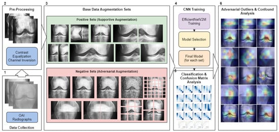40], but without focusing on base data augmentation as the research objective. To the best of our knowledge, our study is the first to investigate both positive and adversarial augmentations in the context of knee joint osteoarthritis and first to explore adversarial augmentation beyond noise injection seen in prior medical imaging work.